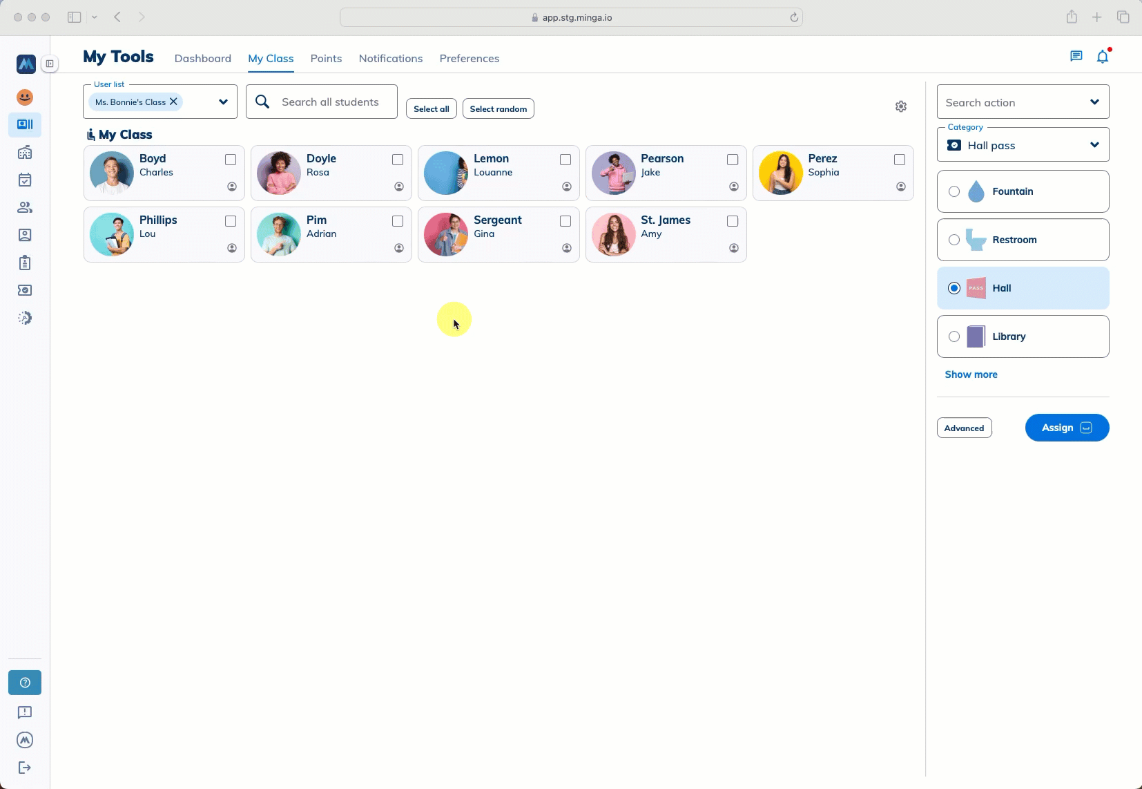Minga's My Class feature is designed to streamline classroom workflows, helping teachers manage their students more efficiently from a single screen. Teachers can assign Hall Passes, track student behaviors, and access important student insights—all