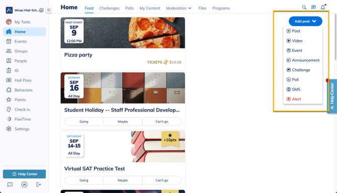 Announcements and Alerts are great ways to get messages out to your school community instantly. Both of these options can be found by clicking on the "Add Post button on the Minga Home Page.