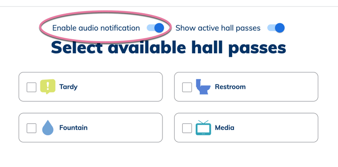 You can also turn the sound notifications ON/OFF by toggling Enable audio notifications when you log into the Kiosk Hall Pass mode.